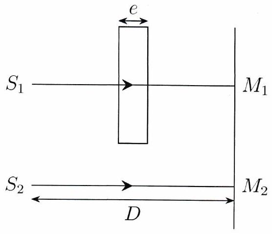 On considère deux rayons lumineux rectilignes et parallèles entre eux, dont l’un traverse une lame de verre d’épaisseur et d’indice optique . En dehors de cette lame de verre, on supposera que les rayons lumineux se propagent dans l’air d’indice . Les sources et sont à la distance d’un écran.