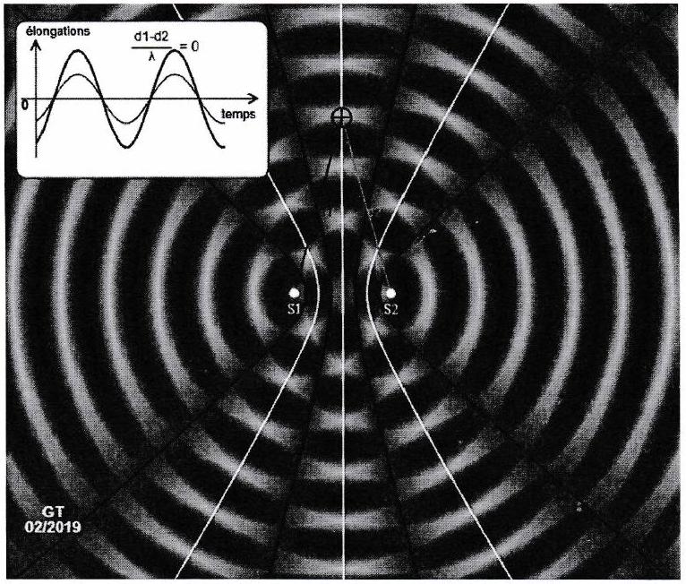 À la surface de l’eau, on observe des zones (lignes claires) où l’amplitude de l’onde résultante est maximale, les deux ondes issues de et sont en phase en tout point de cette ligne brillante.