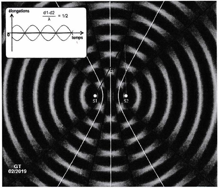 À la surface de l’eau, on observe également des zones (lignes sombres) où l’amplitude de l’onde résultante est faible, voire quasi nulle. Les ondes issues de et sont en opposition de phase en tout point de cette ligne sombre.