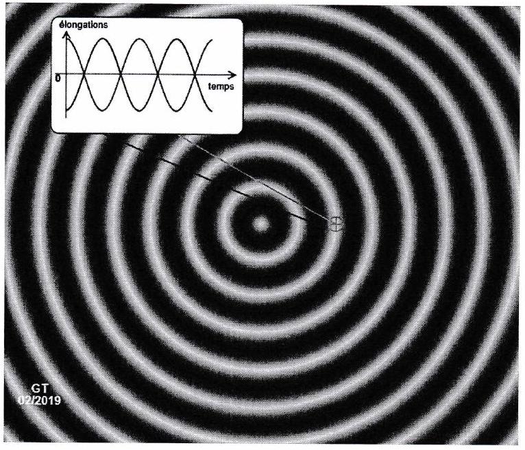 Une pointe attachée à un vibreur frappe la surface de l’eau et crée une onde circulaire qui progresse à la surface. Un système optique permet de visualiser la surface. On néglige toutes les sources d’atténuation de l’onde. On représente l’évolution temporelle du déplacement vertical (“élongation”) avec un point fixe à la surface de l’eau.