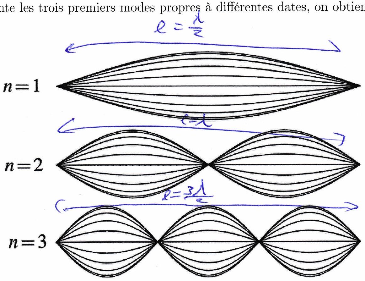 La fréquence est appelée fréquence du mode fondamental. La fréquence pour est la fréquence de l’harmonique de rang . Les modes propres correspondent aux ondes stationnaires sinusoïdales pouvant exister dans une corde en accord avec les conditions aux limites: