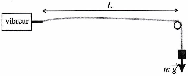 On tend une corde horizontale entre un vibreur et une poulie. La tension de la corde est déterminée par la masse que l’on accroche à l’extrémité pendante : si la poulie est sans frottement et que la masse est immobile, la tension de la corde est égale en norme à . La longueur utile de la corde, notée , correspond à la distance entre le vibreur et la