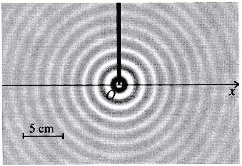 La figure représente la surface d’une cuve à onde éclairée en éclairage stroboscopique. L’onde est engendrée par un vibreur de fréquence . Les zones sombres correspondent aux points “en creux”, et les zones les plus lumineuses aux points les plus élevés.