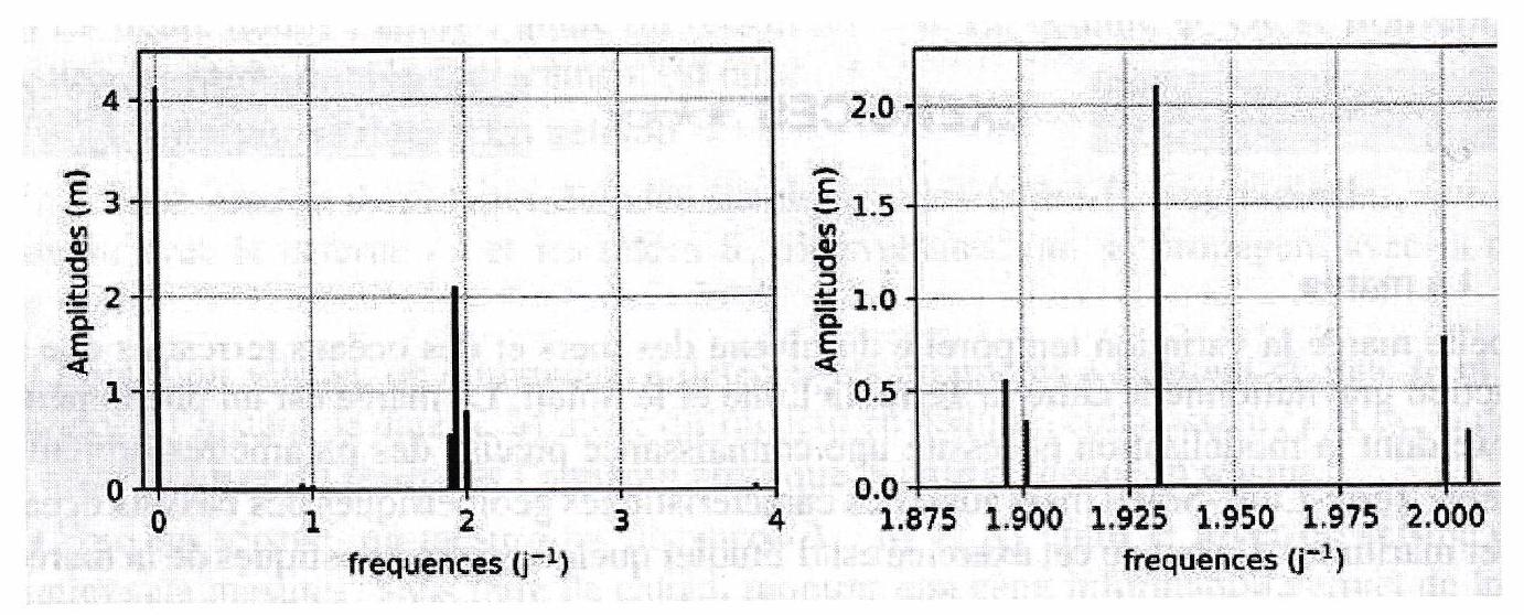 Figure 11.2: Spectrogramme d’amplitude de la marée de Brest calculé à partir du signal de la figure 11.1. La figure de droite est un zoom sur la partie centrale du spectre.