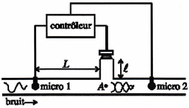 On s’intéresse à un système conçu pour l’élimination d’un bruit indésirable transporté par une conduite. Le bruit est détecté par un premier micro dont le signal est reçu par un contrôleur électronique. Le contrôleur, qui est le centre du système, envoie sur un haut-parleur la tension adéquate pour générer une onde de signal exactement opposé à celui du bruit de manière à ce que l’onde résultante au point (voir figure) et en aval de