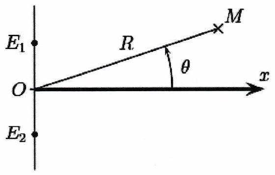 Une expérience d’interférences d’ondes ultra-sonores est réalisée en plaçant deux émetteurs et cote à cote relié à un même générateur. La fréquence d’émission est égale à 40 kHz , ce qui correspond à une longueur d’onde . À part à la question 3 , les sources émettent des ondes en phase. On note le point milieu du segment délimité par les émetteurs distants de , et ( ) l’axe situé sur la médiatrice de ce segment. On déplace le microphone sur un grand cercle de rayon