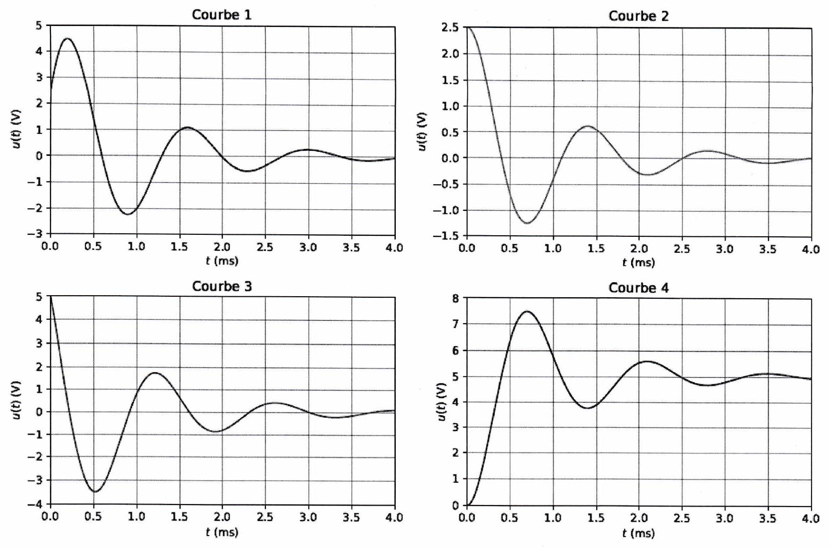 On considère un circuit composé d’une résistance , d’une bobine d’inductance et d’un condensateur de capacité . On soumet le circuit à un échelon de tension tel que :