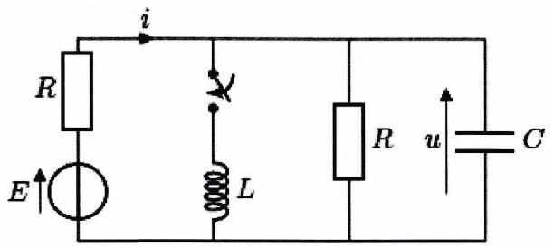 Le circuit représenté ci-contre est alimenté par un générateur de tension continu de f.é.m. E. On suppose que l’interrupteur est ouvert depuis très longtemps. À l’instant , on ferme l’interrupteur.