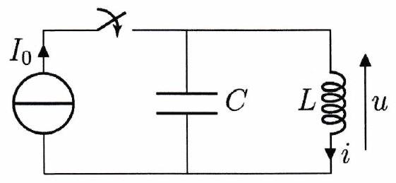 On étudie le circuit ci-contre. Pour , le condensateur est déchargé et aucun courant ne circule dans le circuit. À l’instant , on ferme l’interrupteur, ce qui connecte le générateur idéal de courant en parallèle avec le condensateur et la bobine.