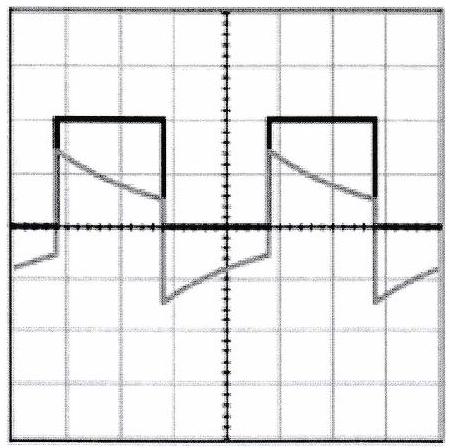 La figure ci-contre montre un signal créneau de période tel qu’on le visualise en utilisant le couplage DC (courbe en noir) ou le couplage AC (courbe en gris) d’un oscilloscope. Le calibre vertical est division dans les deux cas. Lorsque le couplage AC est choisi, le signal passe à travers un filtre du premier ordre.
