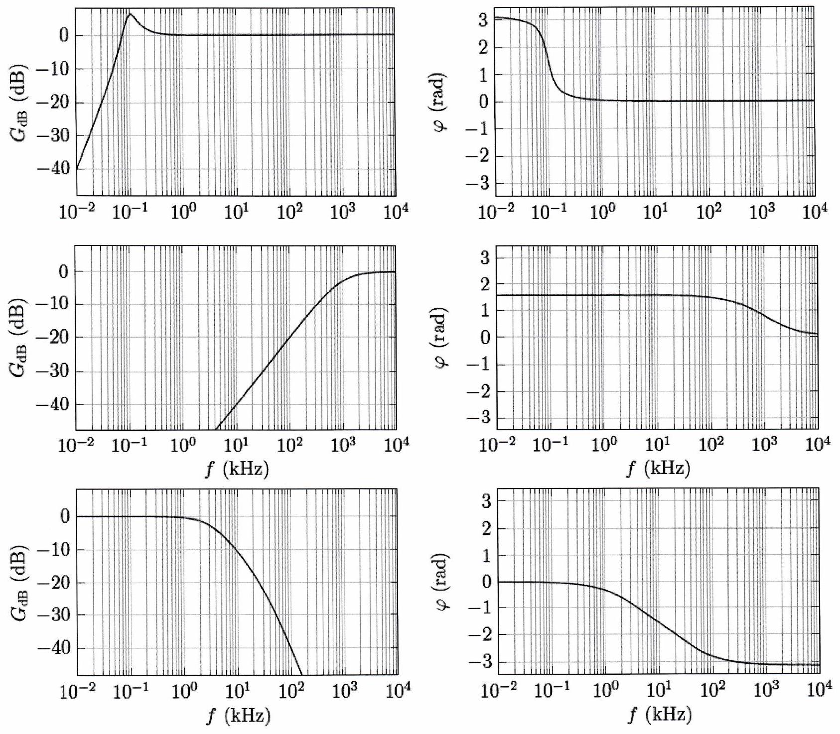 Pour les trois diagrammes de Bode ci-dessous, indiquer le type de filtre dont il s’agit. Préciser s’il peut s’agir d’un filtre d’ordre 1 ou non. Déterminer ensuite, pour chaque filtre, l’expression du signal de sortie si l’on envoie en entrée le signal de fréquence suivant :