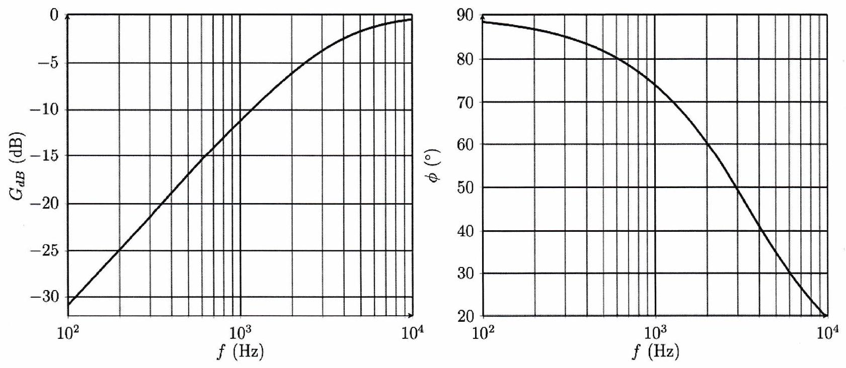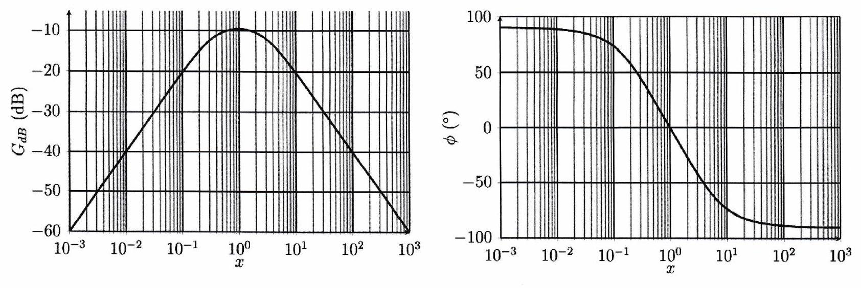 Donner les expressions de et . 3. Exprimer le gain linéaire, le gain en dB et le déphasage de la tension de sortie par rapport à celle d’entrée, en fonction de . 4. Calculer simplement le gain maximal du filtre, exprimer sa valeur en dB , et calculer le déphasage correspondant. 5. Déterminer les fréquences de coupure et en déduire la bande passante du circuit. 6. Le diagramme de Bode de ce filtre est représenté ci-dessous. Expliquer les valeurs prises par la pente en haute et basse fréquence. 7. Déterminer l’expression du signal de sortie pour un signal d’entrée de la forme :